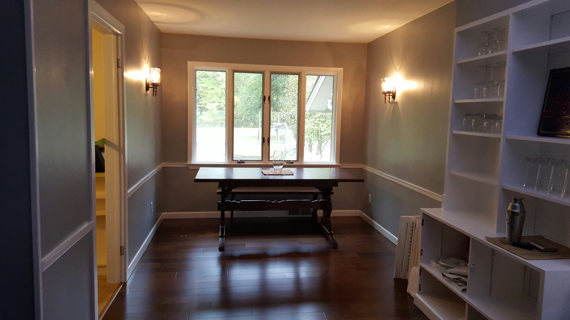 The Diningroom A WORK IN PROGRESS: gray walls, white trim and hardwood flooring.